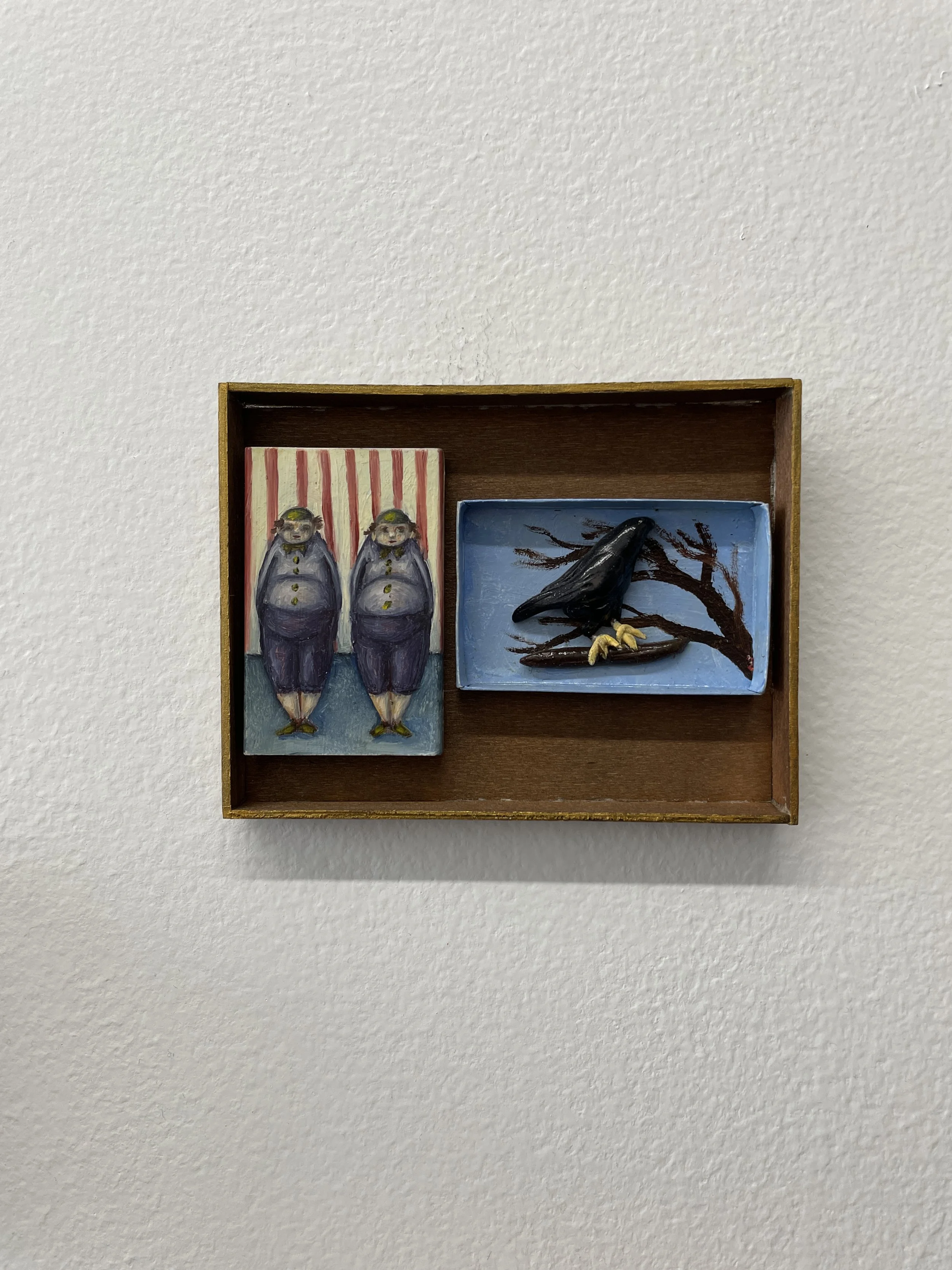 Oil painting on matchbox cover and hand built interior in a custom made 4” x 3” shadowbox.